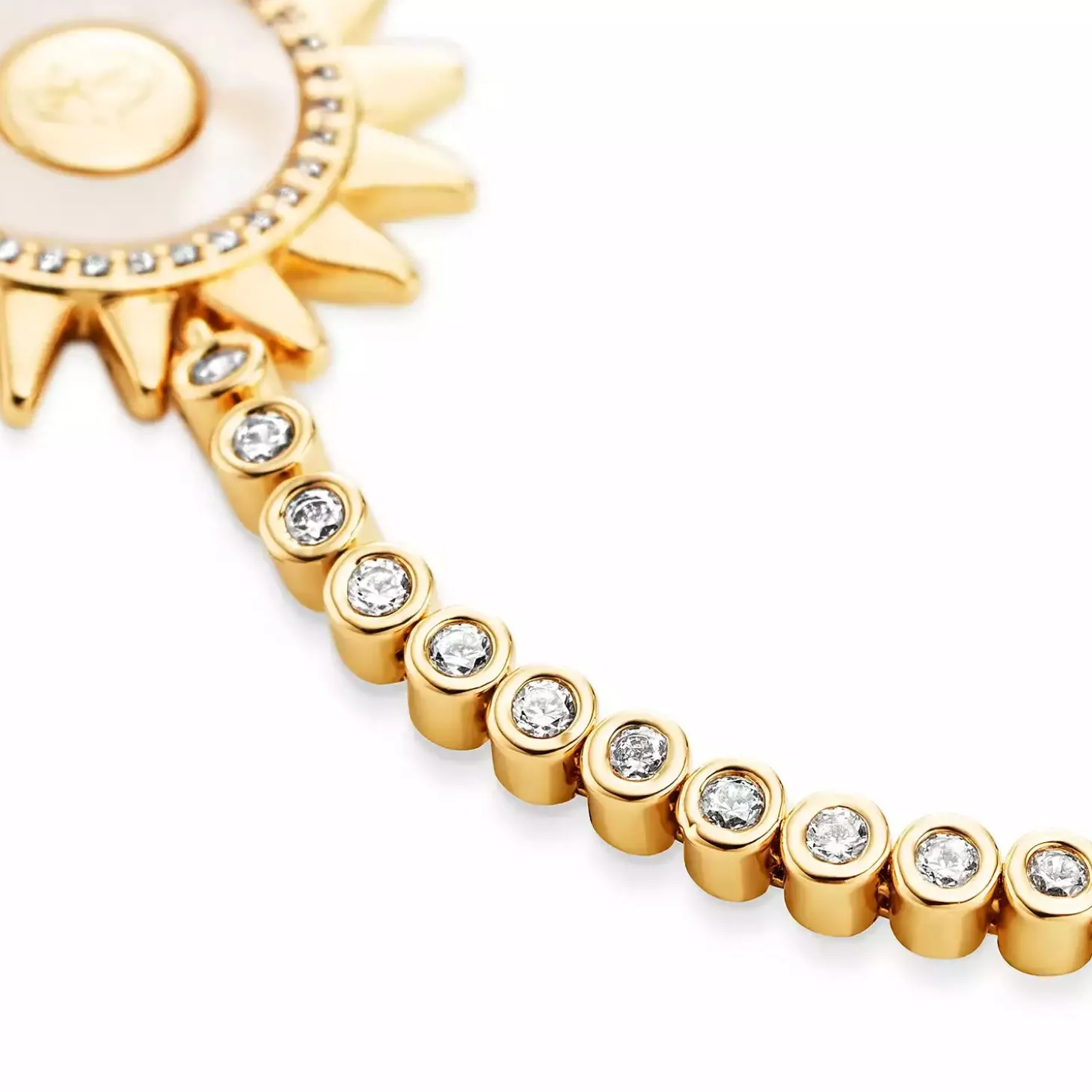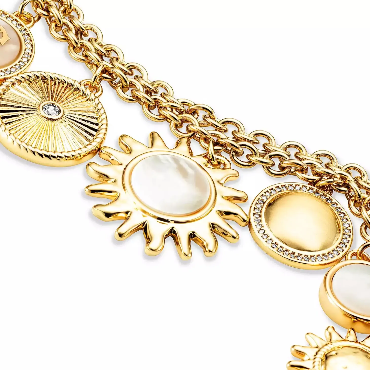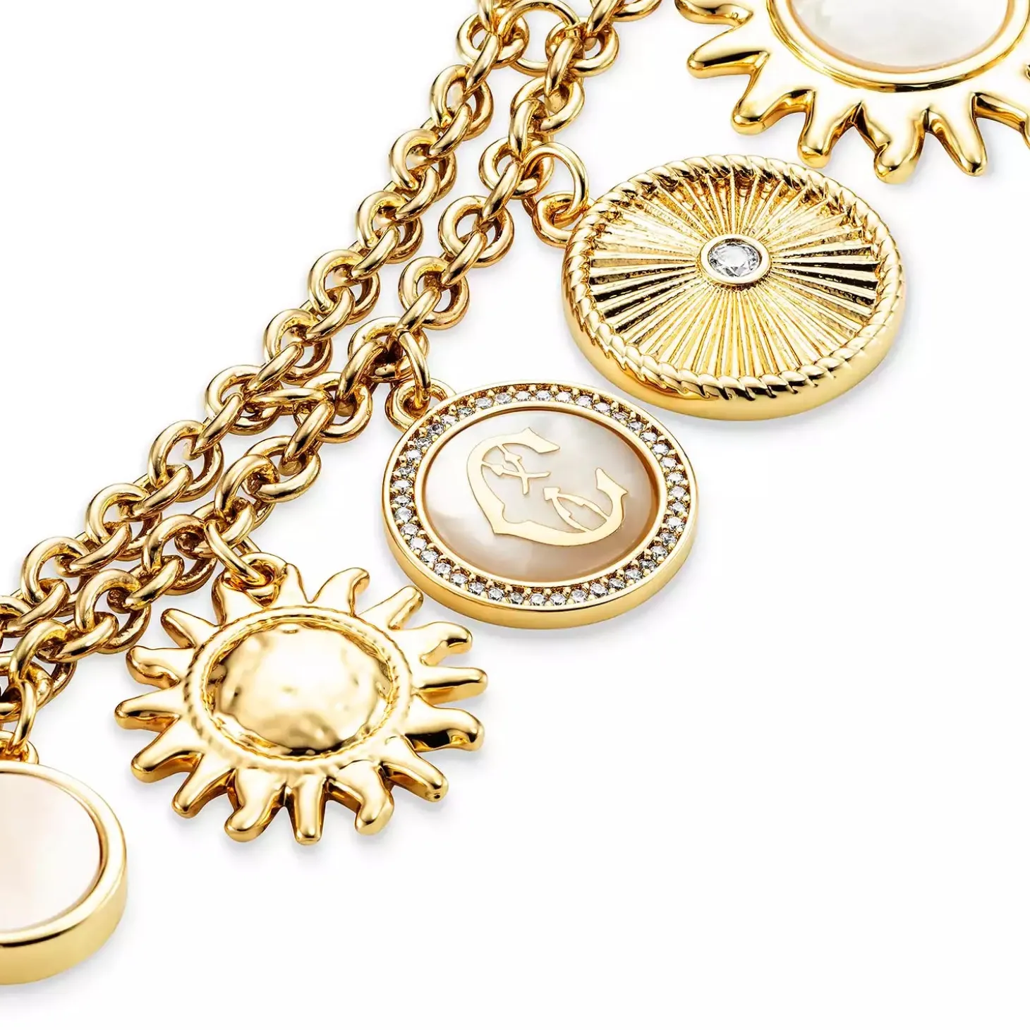 From the gates of Versailles to the whitewashed seaports on the Riviera, the Frenchhave a way with the sun. It is, in fact, perfectly symbolic of a certain style of living – alife force, a symbol of brilliance and energy, and a future full of possibility. The motifwas emblematic enough to be tapped as the insignia of the original St Tropezcollection. Rescued from the archive, the shining symbol has been revived and placedat the center of a collection all its own.The Sunflare Collection is a dazzling line of striking jewelry that emits radiantelegance. Naturally, the materials are warm, a cheerful yellow gold tone over brass. Acluster of charms catch the light – dials and discs, spheres and rays, delicately offsetwith mother of pearl and CZ stones. The collection unfolds as steadily as the hours of aday, the medallions set as necklaces, bracelets, rings and earrings, each as sunny as thelast. Strands abound, both thick and delicate chains, with a subtle radial arrangementthat mimics the physicality of our nearest star. Debuting for Resort 2022, theirresistible presentation comes at just the right moment in the year – as the days growshorter and temperatures drop, we invite you to follow the sun.