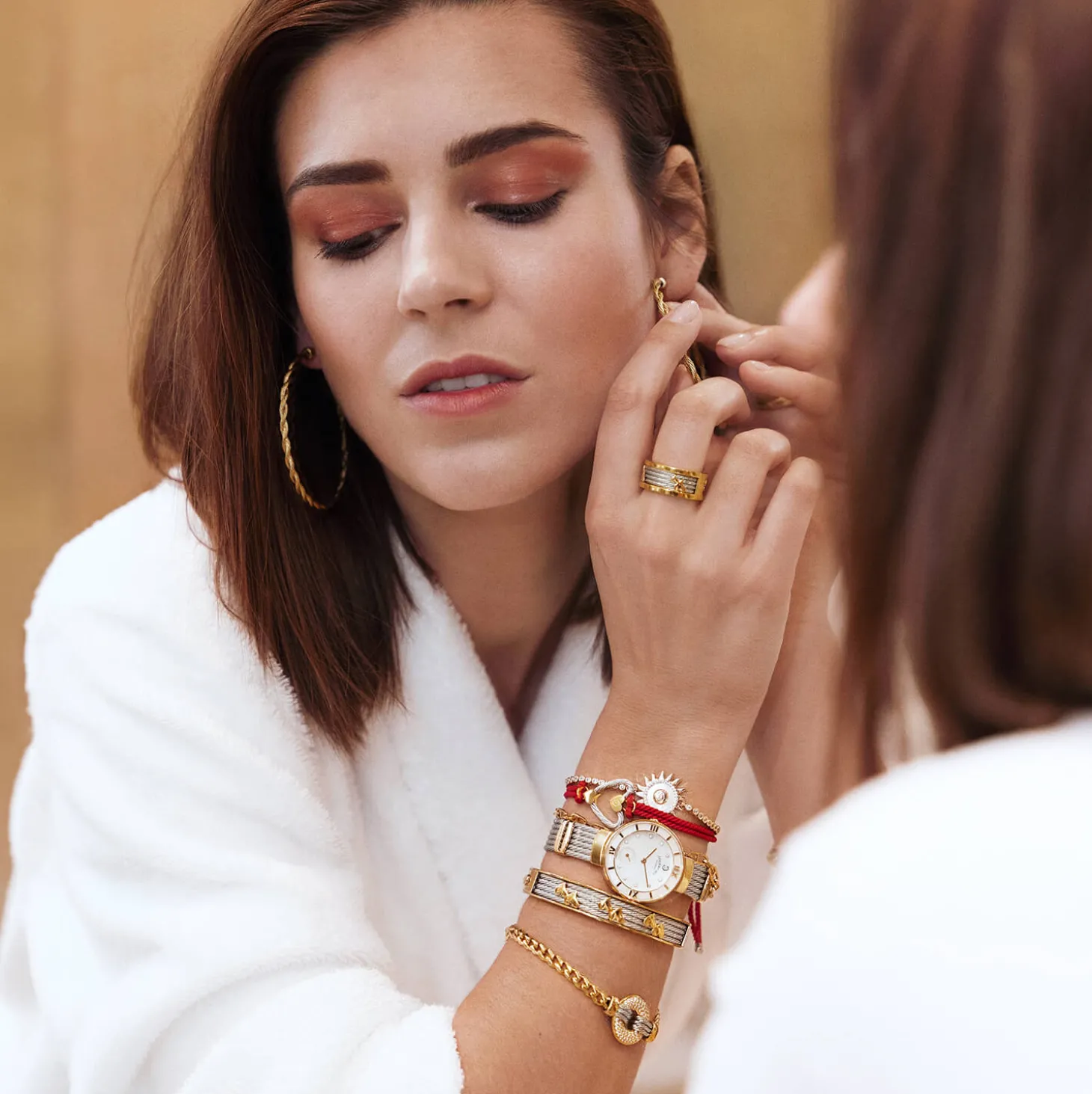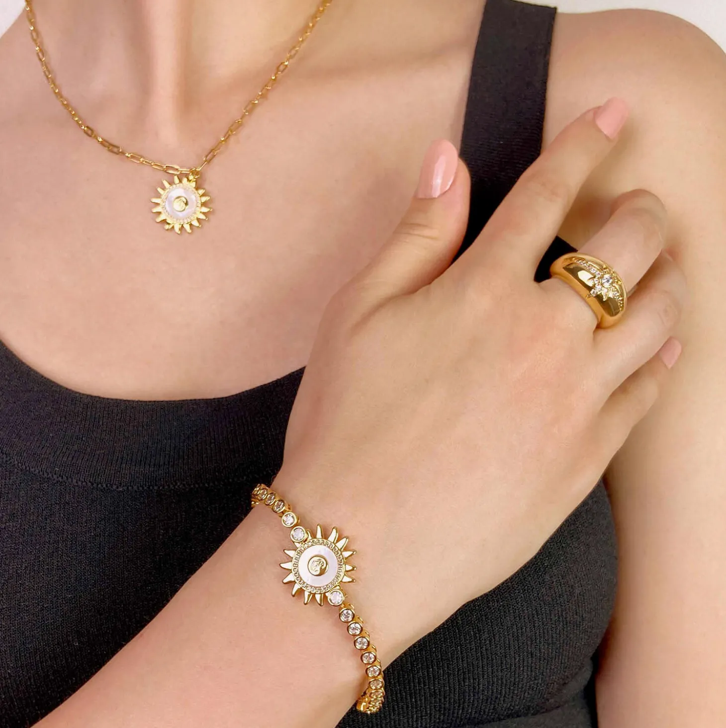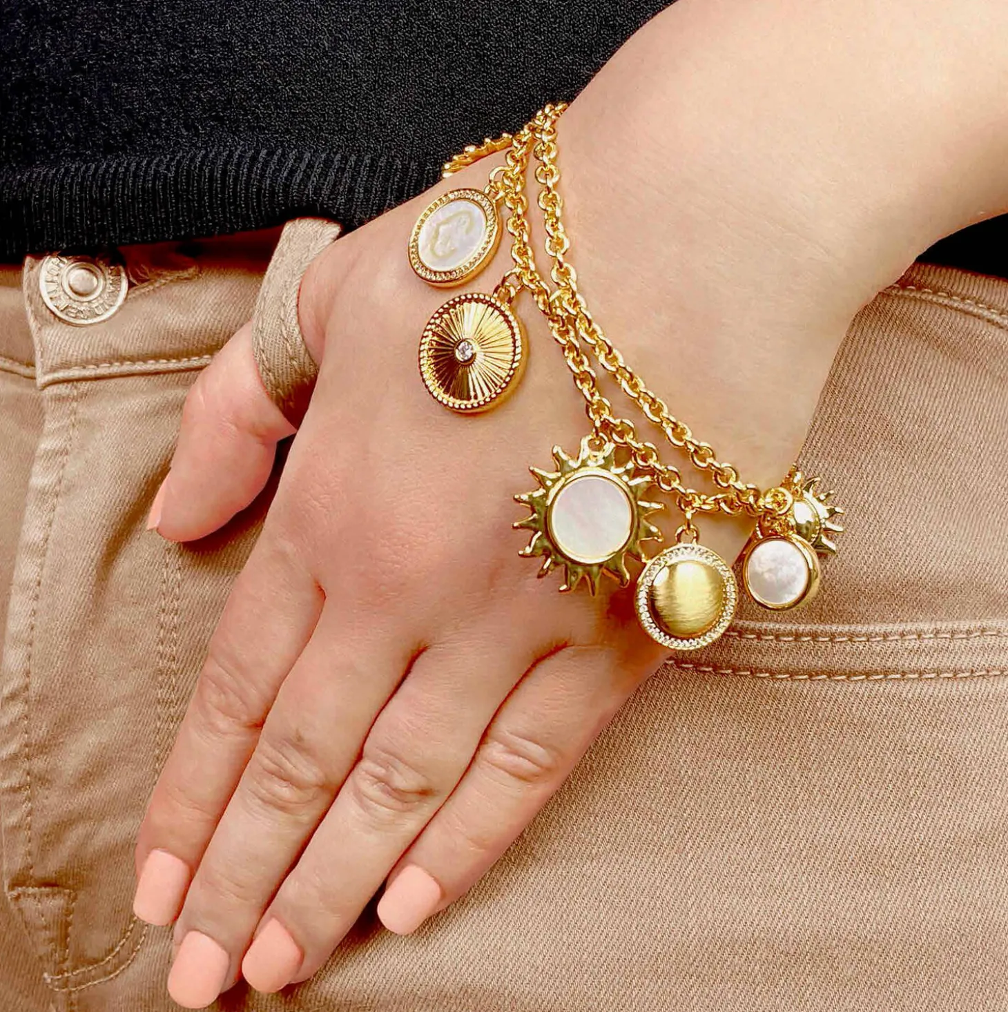 From the gates of Versailles to the whitewashed seaports on the Riviera, the Frenchhave a way with the sun. It is, in fact, perfectly symbolic of a certain style of living – alife force, a symbol of brilliance and energy, and a future full of possibility. The motifwas emblematic enough to be tapped as the insignia of the original St Tropezcollection. Rescued from the archive, the shining symbol has been revived and placedat the center of a collection all its own.The Sunflare Collection is a dazzling line of striking jewelry that emits radiantelegance. Naturally, the materials are warm, a cheerful yellow gold tone over brass. Acluster of charms catch the light – dials and discs, spheres and rays, delicately offsetwith mother of pearl and CZ stones. The collection unfolds as steadily as the hours of aday, the medallions set as necklaces, bracelets, rings and earrings, each as sunny as thelast. Strands abound, both thick and delicate chains, with a subtle radial arrangementthat mimics the physicality of our nearest star. Debuting for Resort 2022, theirresistible presentation comes at just the right moment in the year – as the days growshorter and temperatures drop, we invite you to follow the sun.