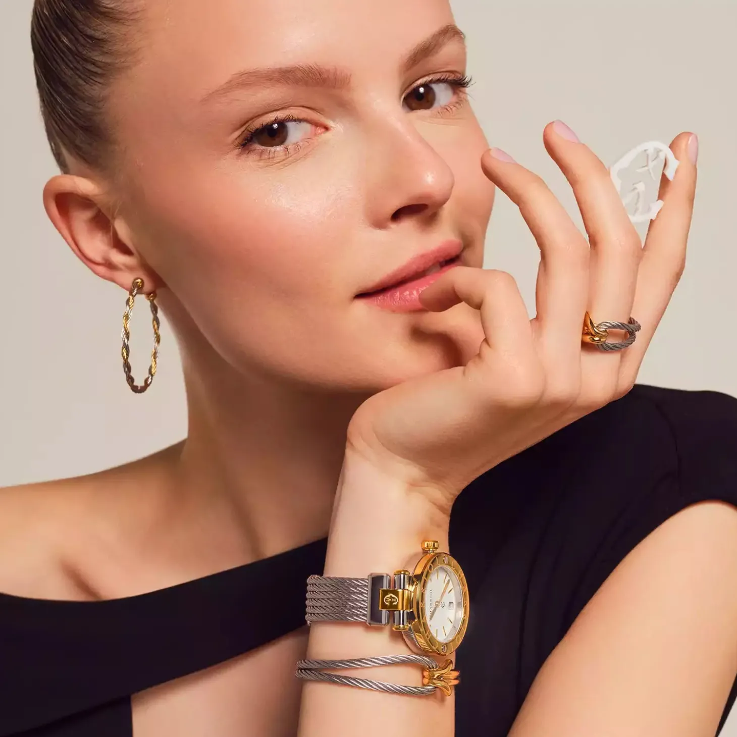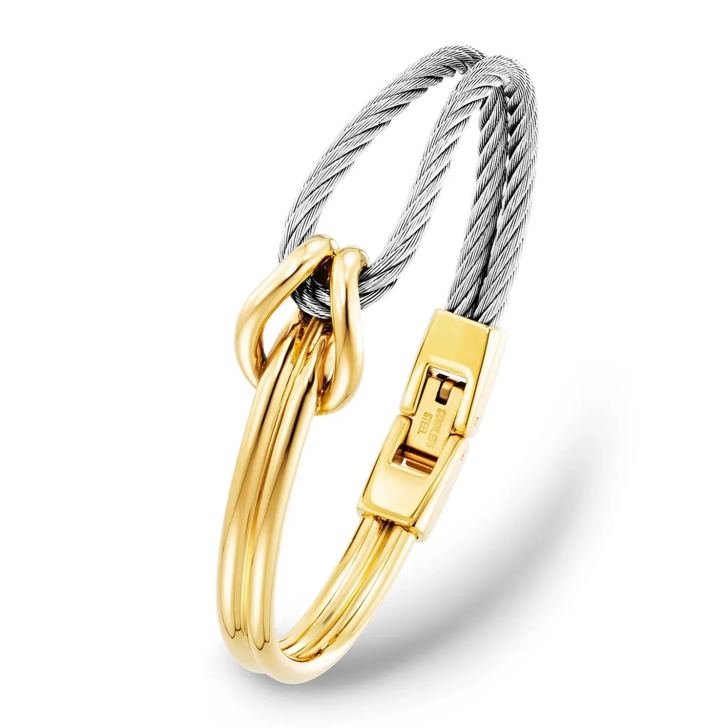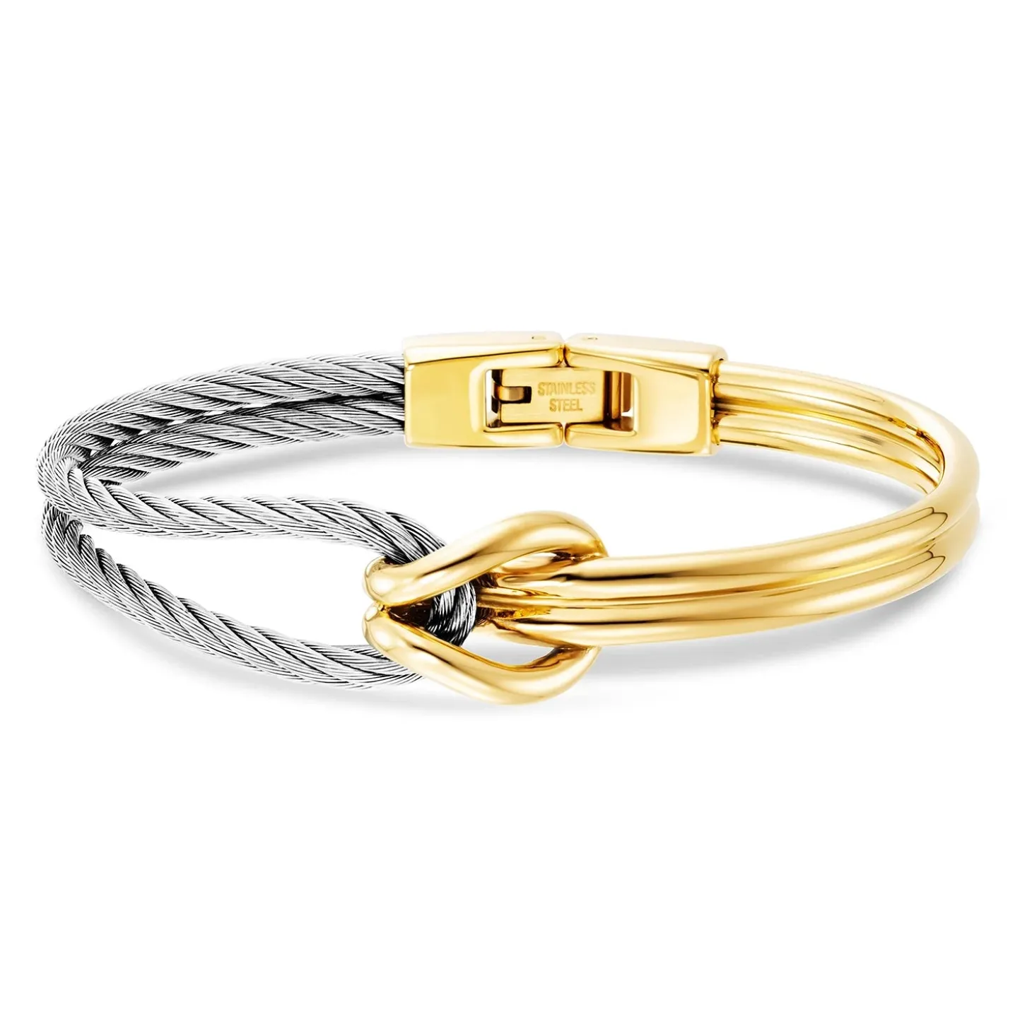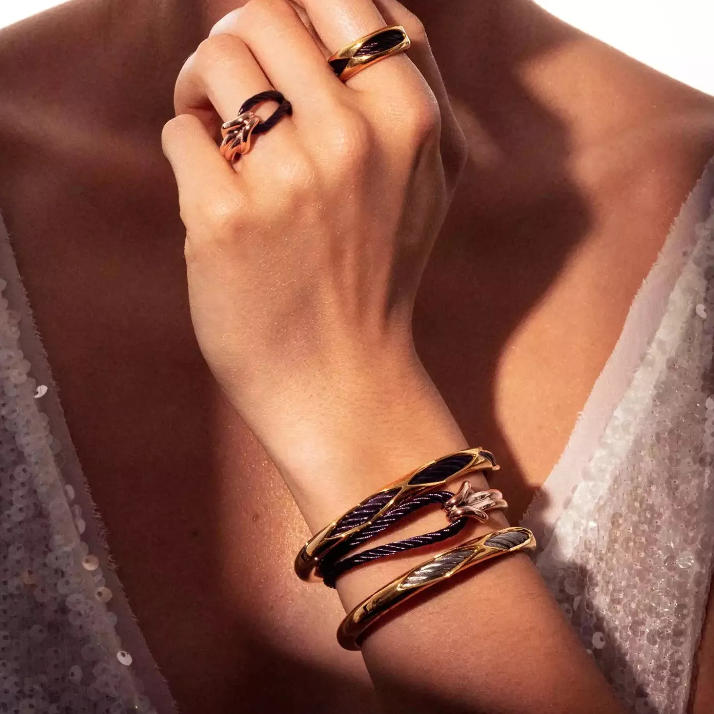 A recurring motif found in the dimensionaldecoration of Celtic style is the endless knot, a deft design wherein a simple pattern interlaces back on itself – a nod to the notion of an endless continuum.As such, our Celtic® Knot line enacts a symbol ofeternity and an emblem of fidelity as two parallel lines fold over a loop of iconic twisted cable to form a pleasing configuration that is at once refined and resolute.Such an agreeable impression of satisfying design extends to the ring and earring sets, pieces that are compact, enduring and lovely – the trifecta of daily wear.The line binds our signature cable to yellow gold PVD, an elegant juxtaposition of light and dark, textured and smooth, simple and ornate, a binary proposal built for a signature style.